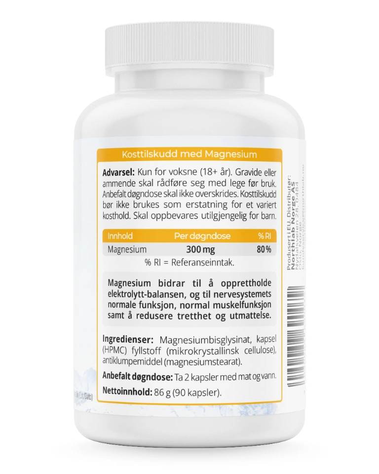 | Per kapsel | 150 mg chelatert magnesium (som magnesiumbisglycinat) |