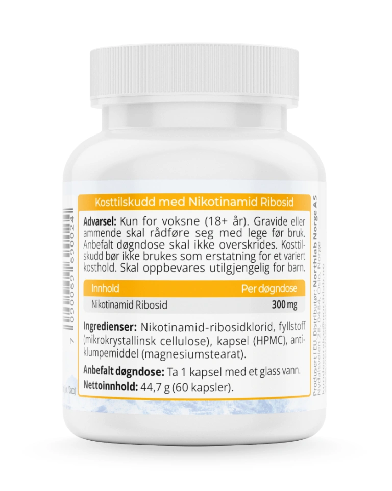 Ingredienser: Nikotinamid Ribosidklorid, fyllstoff (Mikrokrystallinsk Cellulose), vegansk kapselskall, antiklumpemiddel (Magnesiumstearat)Innhold per kapsel: Nikotinamid Ribosidklorid 300mg |