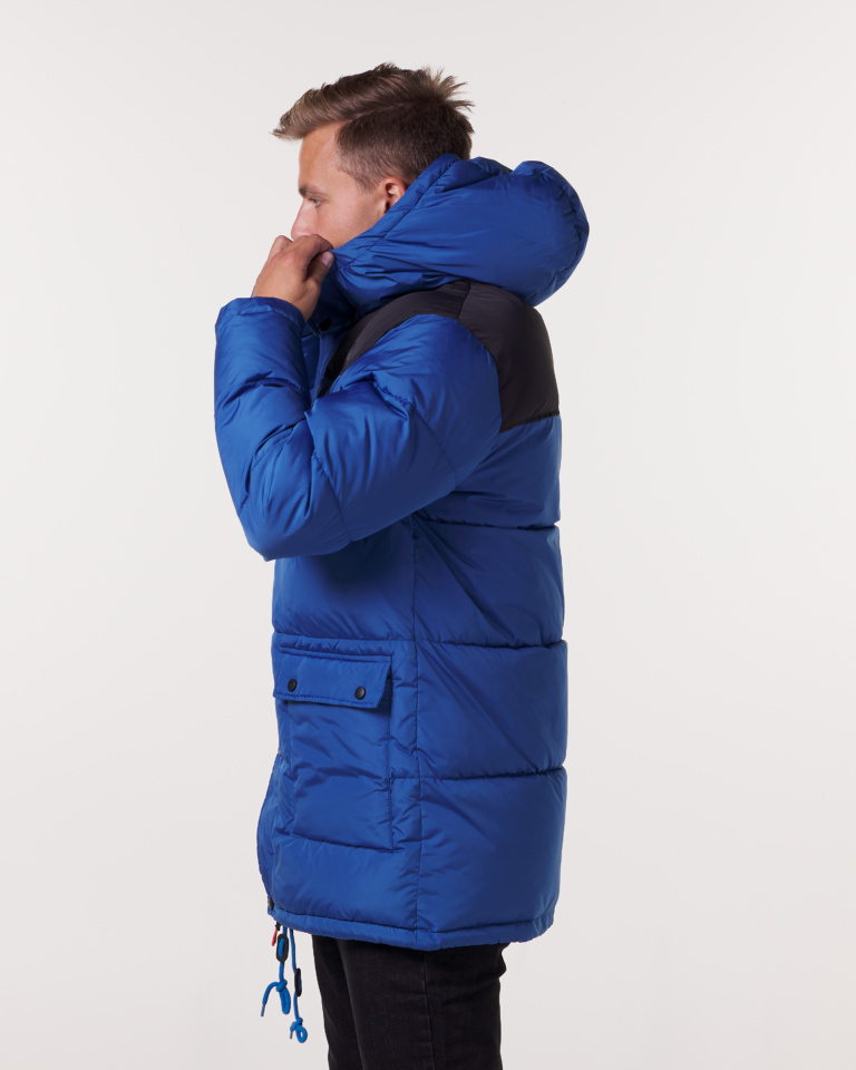 Pufferjakke som er veldig varm og fôret. Hette med snor for å justere kanten. Høy hals, med knepping og glidelås som går hele veien ned i midten. Lommer foran og på innsiden. Linningen har en justerbar snor, du finner kun en liten “Outdoor Essentials”-print øverst på venstre bryst.