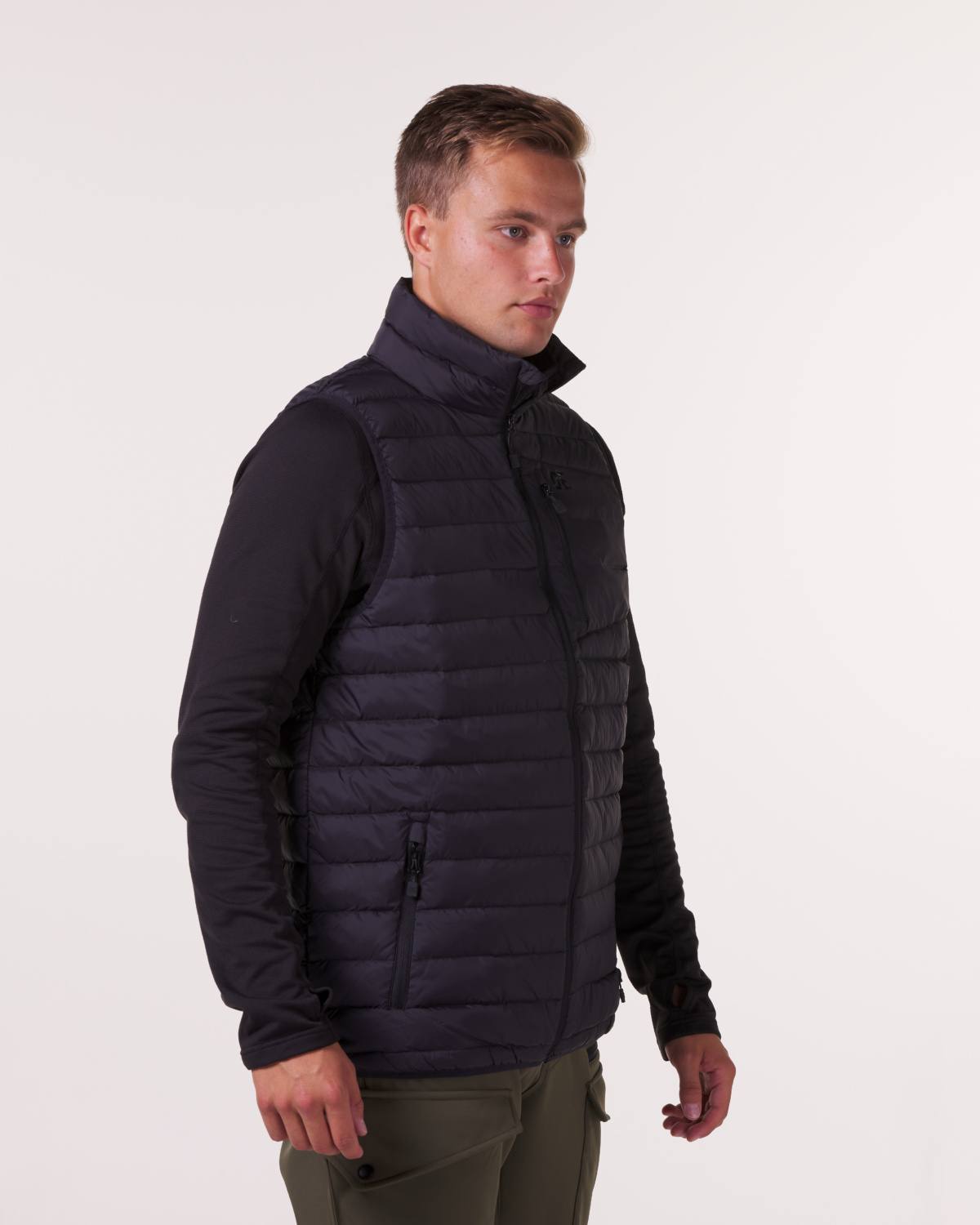 Dunvest for herre i lett, men slitesterk og funskjonell konstruksjon. Høy hals med glidelås som går hele veien ned og hakebeskyttelse øverst. Én bryst- og to sidelommer med reversert spiralglidelås. Kroppsnær passform, passer fint under en skalljakke. Vester gir mer varme enn de fleste er klar over, og hjelper til og med å holde organene varme. Passer bra å bruke på tur i naturen, eller i hverdagen for en sporty og naturinspirert look.