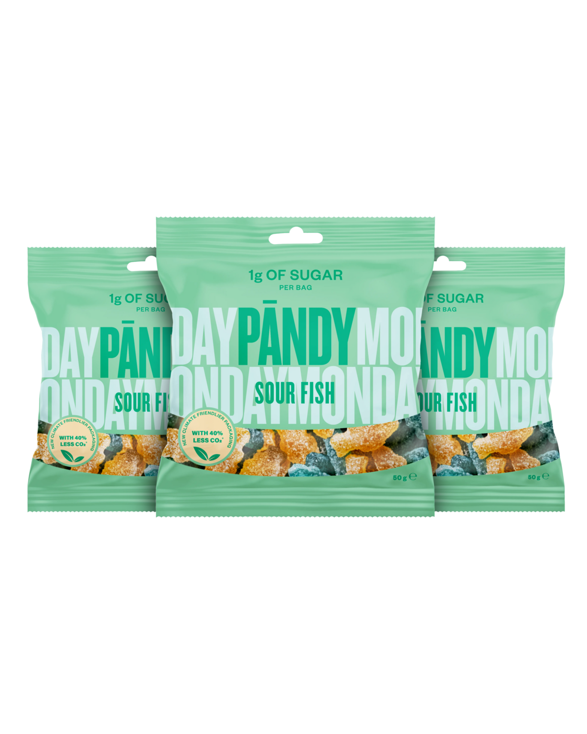 En blanding av gul og blå gummifisk med smak av sitron og blåbær!