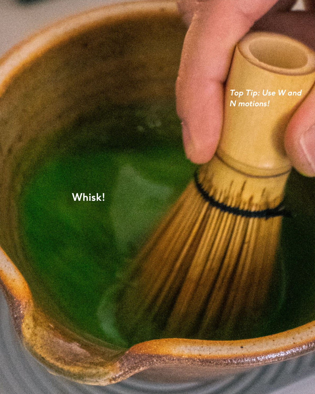 - Visp: Visp til matchaen er skummende. Du kan bruke: en tradisjonell bambusvisp (chasen), en håndholdt melkeskummer eller en blender.