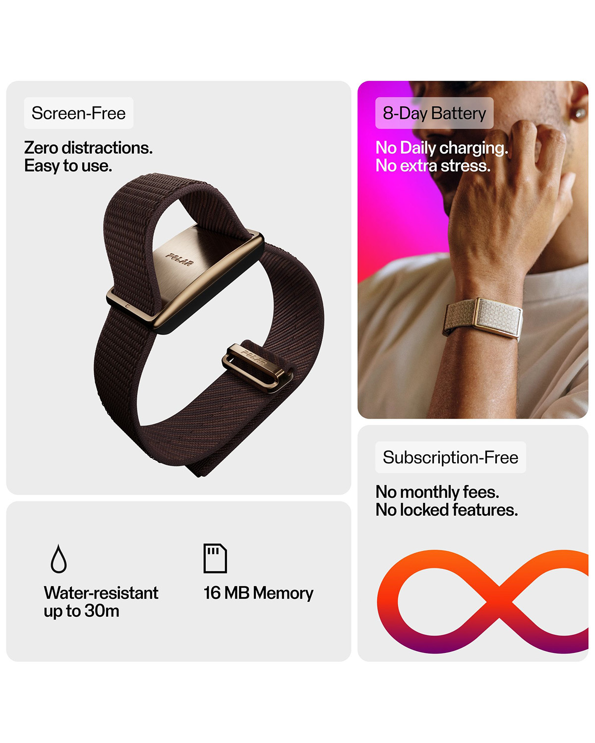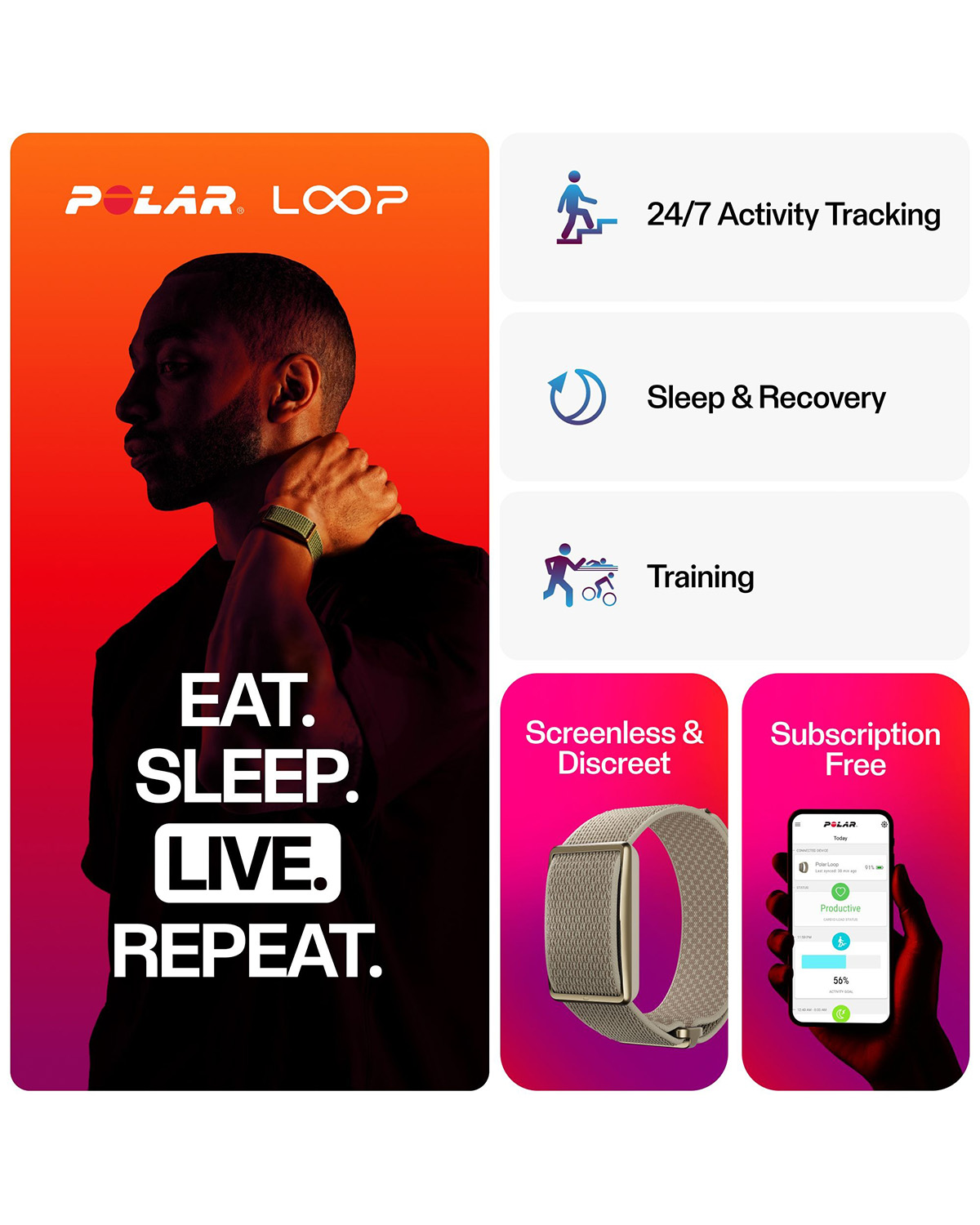 Med registrering av puls, søvn og daglig aktivitet 24/7 byr POLAR Loop på nyttig kunnskap du kan benytte deg av for å øke velværet, kondisjonen og daglig ytelse – uten distraksjoner eller overdrevent mye data. Bruk det hele dagen, la det registrere aktiviteten din i fred og ro, og sjekk resultatet når du føler for det. Ingen skjermer. Ingen forstyrrelser. Ingen månedsavgifter.