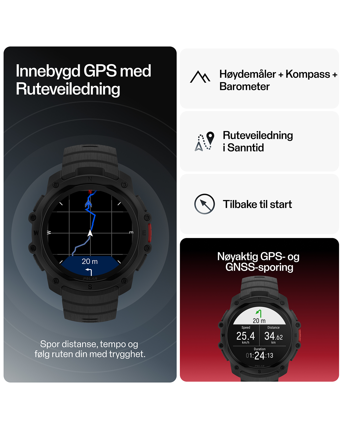 - Innebygd GPS og ruteveiledning for løping og trening utendørs