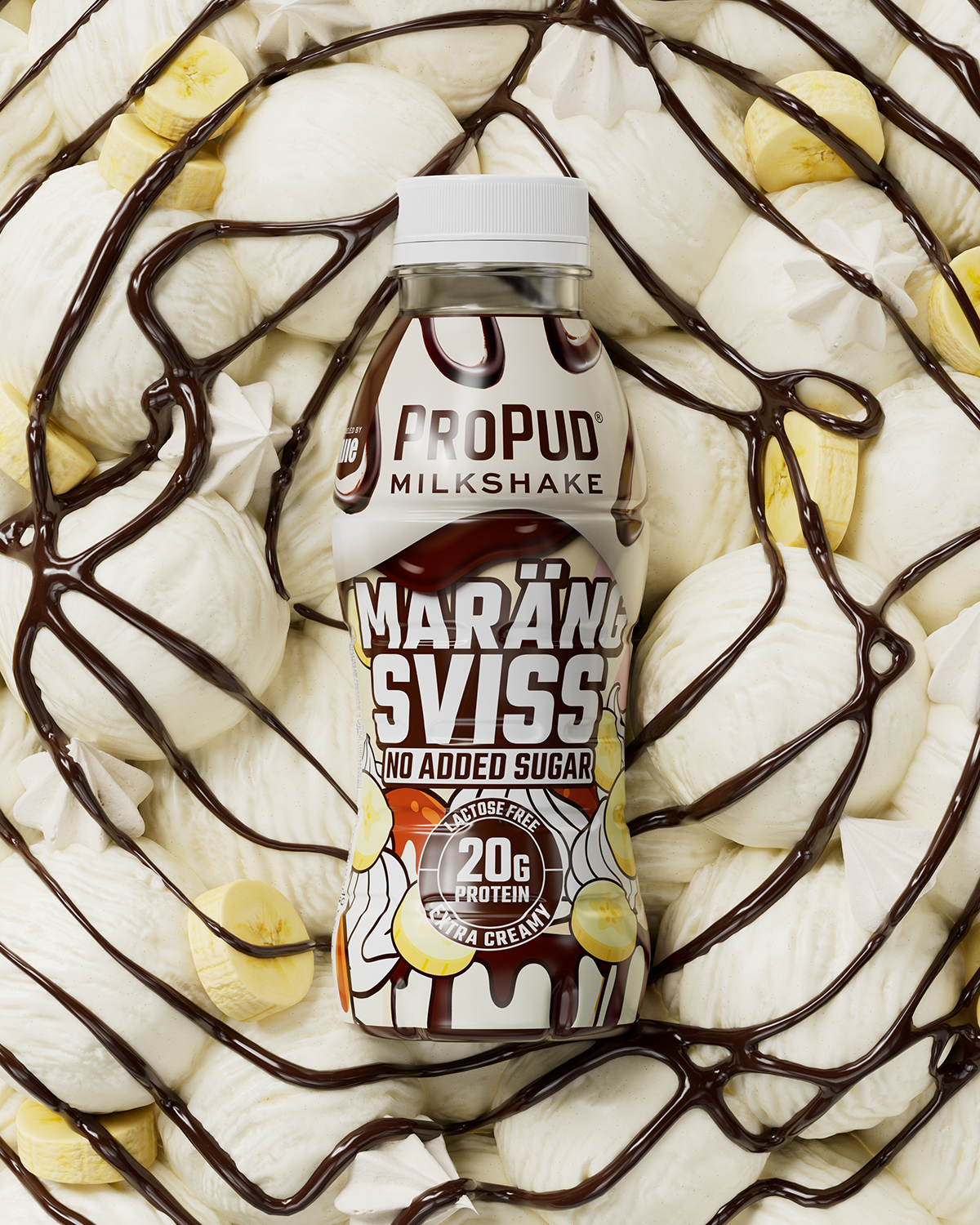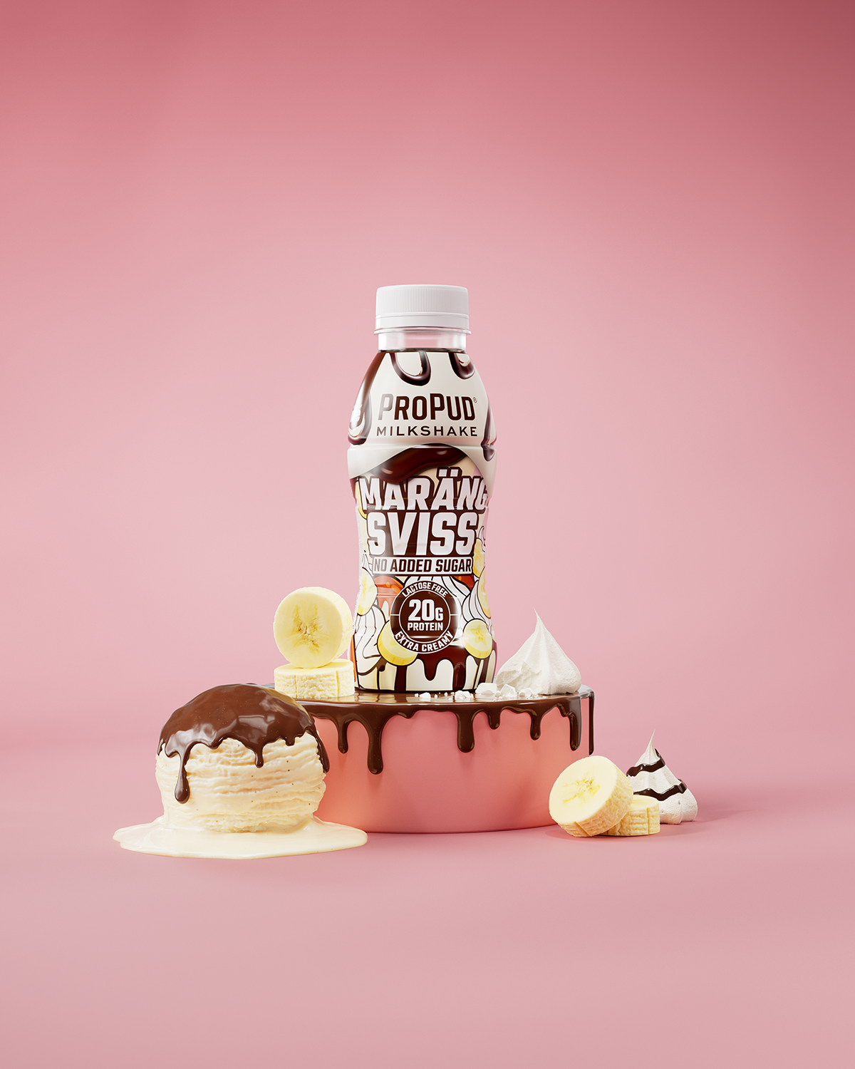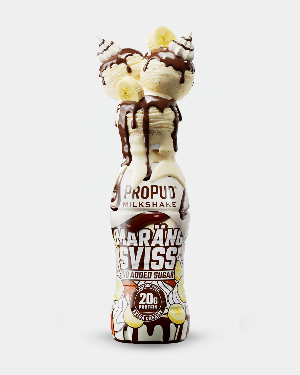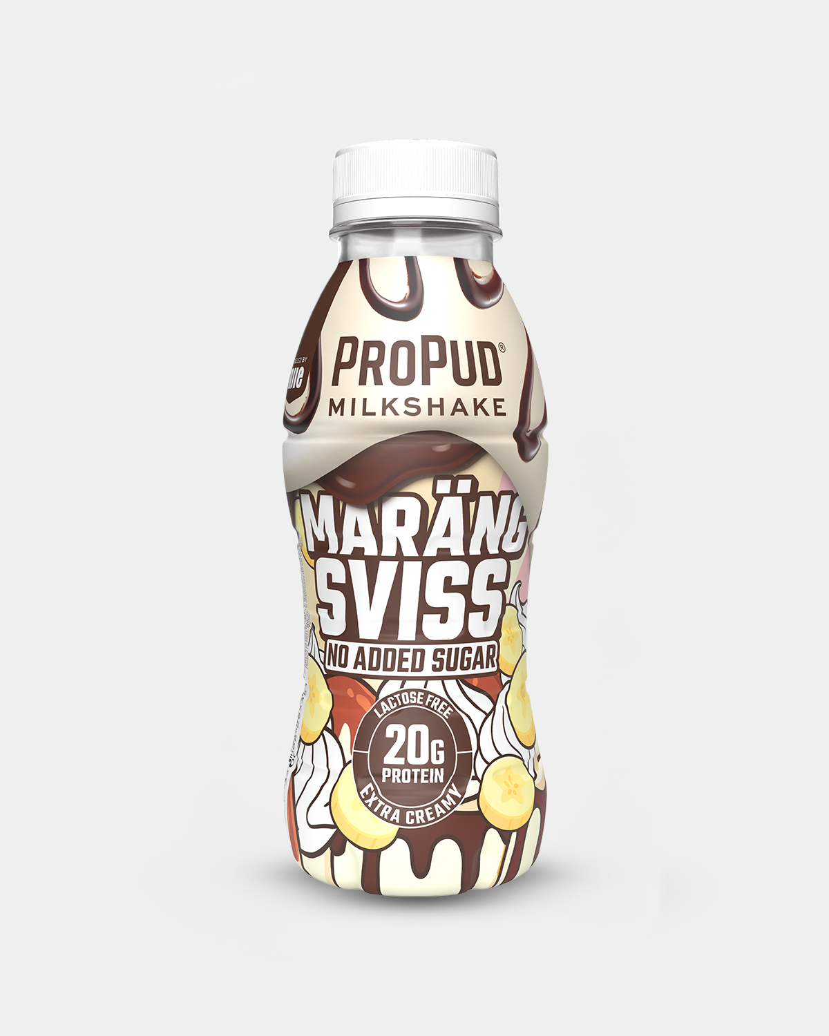 ProPud Protein Milkshake Marängsviss er en fyldig og kremet proteinmilkshake med smak av den klassiske svenske desserten marängsviss – en herlig kombinasjon av søt marengs, sjokolade og banan. Perfekt som et proteinrikt mellommåltid, etter trening eller når du har lyst på noe godt med god samvittighet.