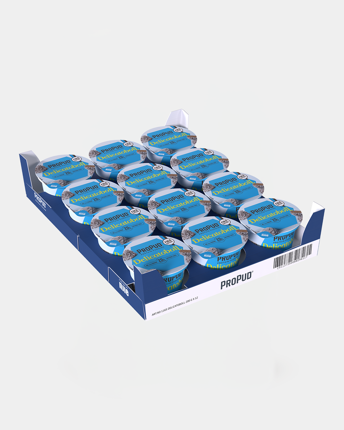 ProPud Delicatoboll er en kremet og smakfull proteinpudding inspirert av klassisk sjokoladeboller – perfekt for deg som vil ha noe søtt uten å gå på kompromiss med kostholdet. Med høyt proteininnhold, lavt fett og uten tilsatt sukker får du et smart mellommåltid som passer like godt etter trening som til hverdagskos.