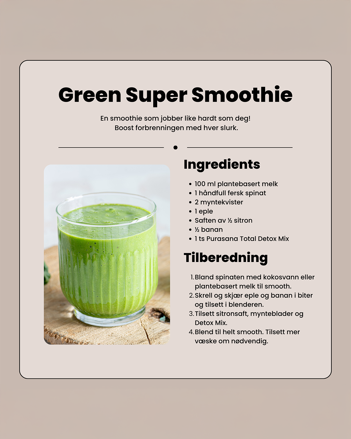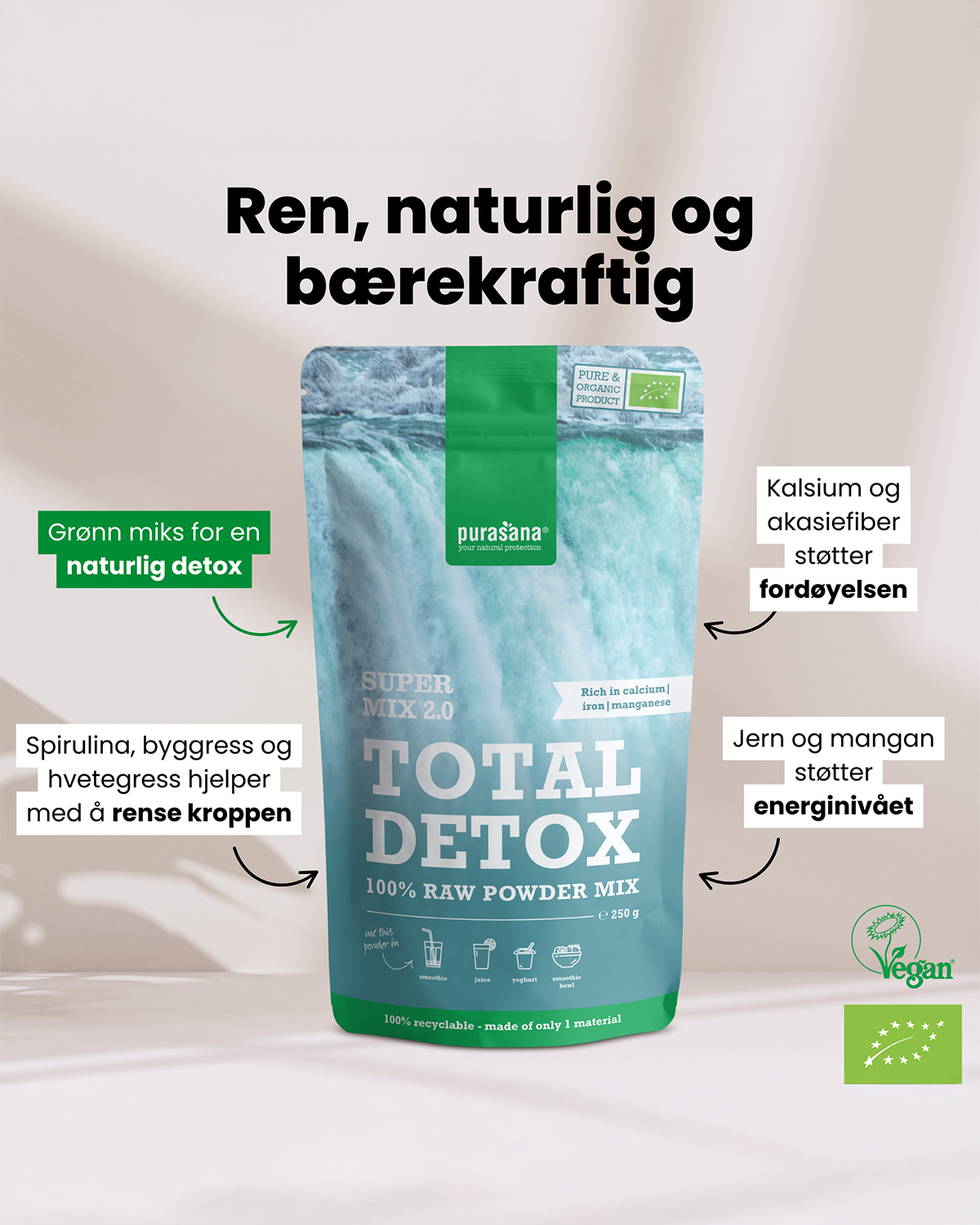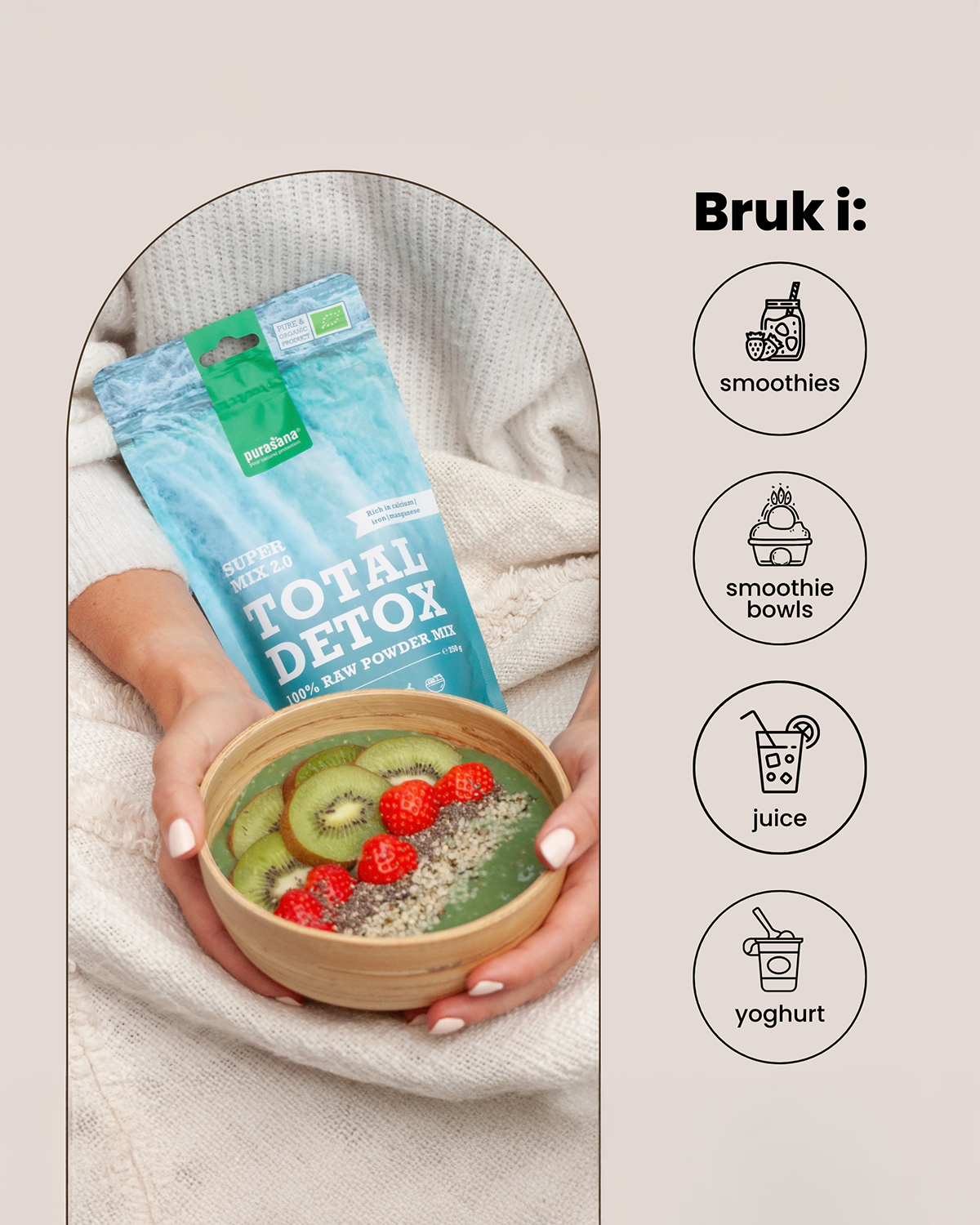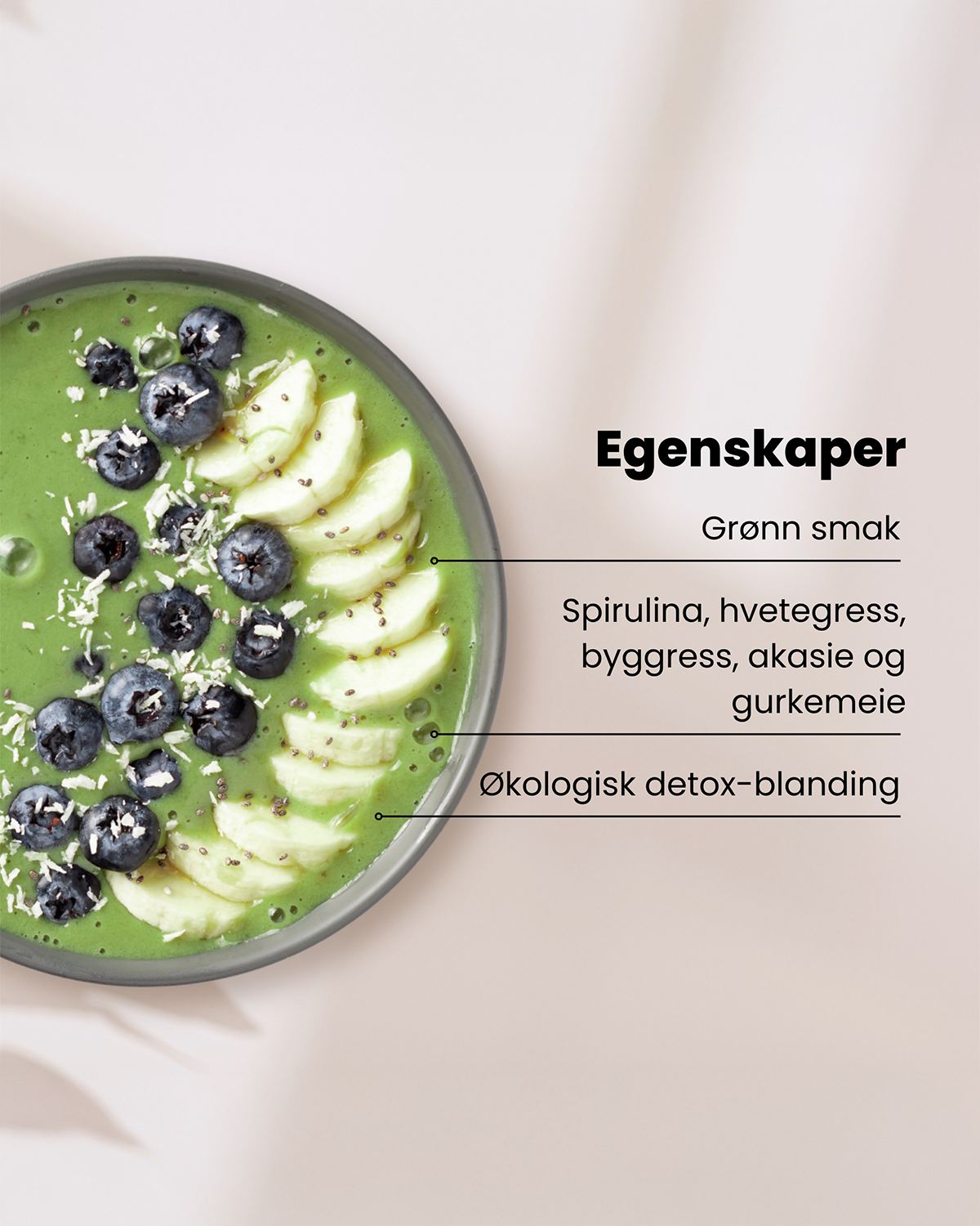 Total Detox Mix passer godt i smoothies, shakes eller blandet med vann, og er et enkelt valg for deg som ønsker en grønn miks som en del av dine daglige rutiner.