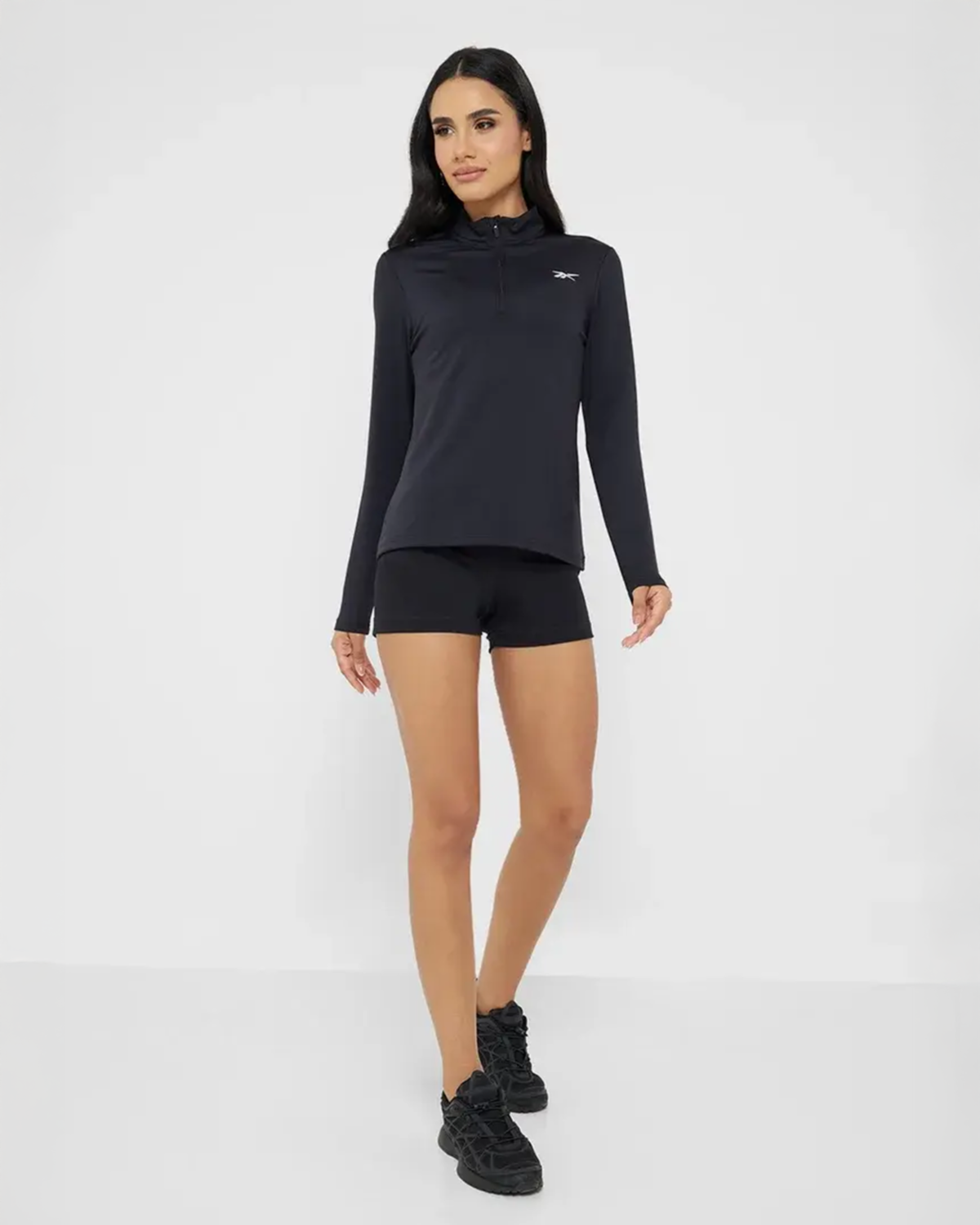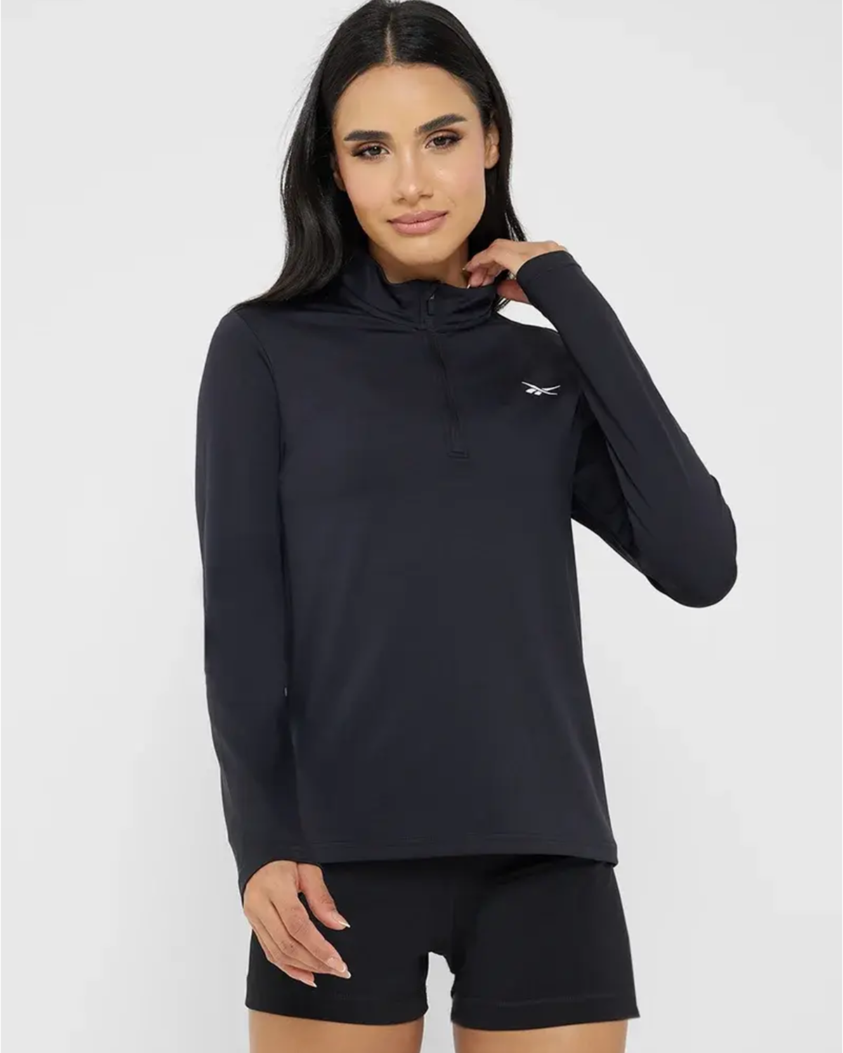 Denne langermede treningsgenseren er laget i myk jerseykvalitet med 91 % polyester og 9 % elastan, noe som gir en fleksibel og tettsittende passform som følger bevegelsene dine under trening. Den høye kragen med glidelås og hakebeskyttelse gir både komfort og funksjonalitet, samtidig som den holder deg varm under oppvarming eller på kjølige dager.