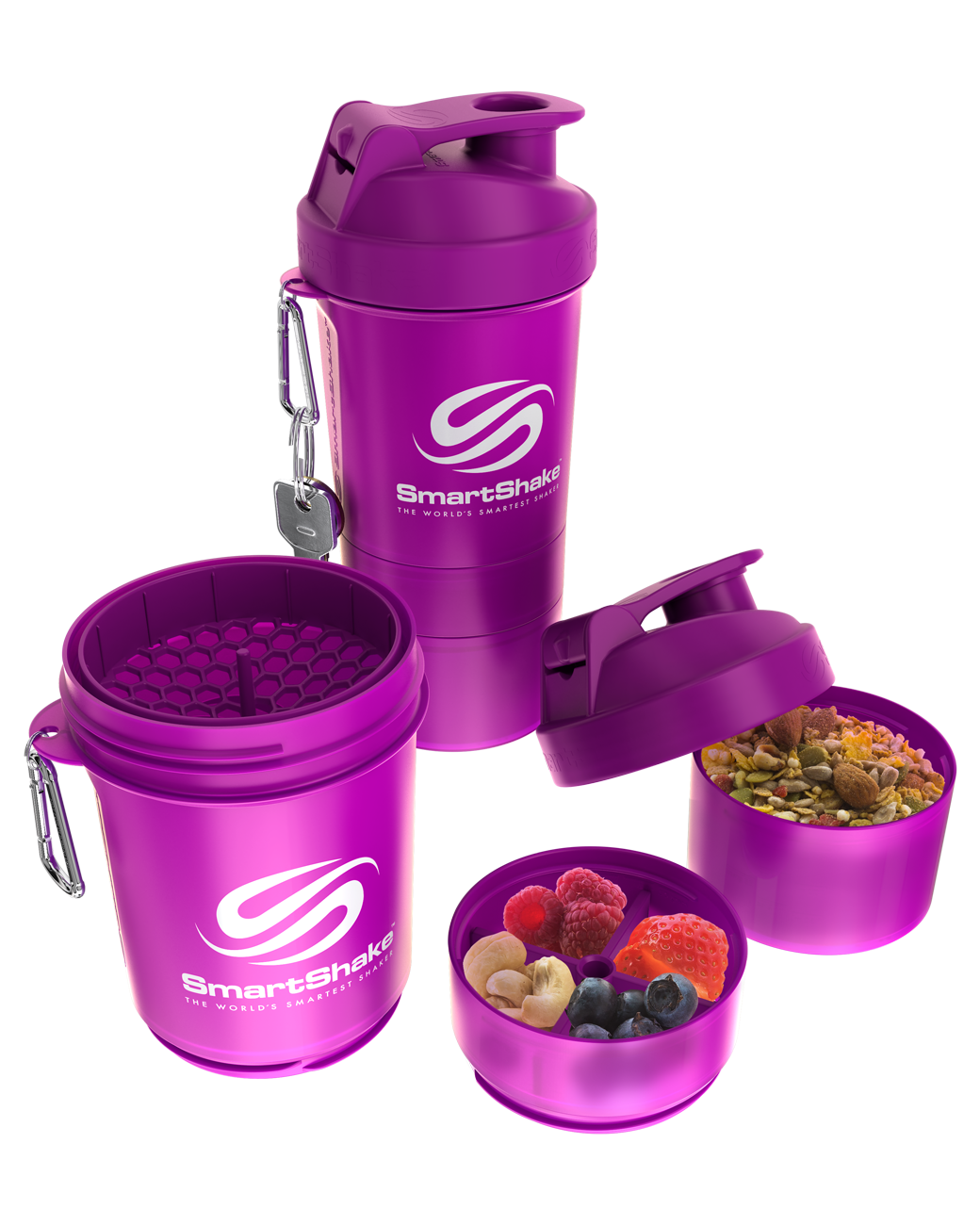SmartShake Original 600 ml, Neon Purple har to separate beholdere der du enkelt kan oppbevare flere porsjoner kosttilskudd, f.eks. proteinpulver, kreatin, kapsler eller før- og etter treningsprodukter.
