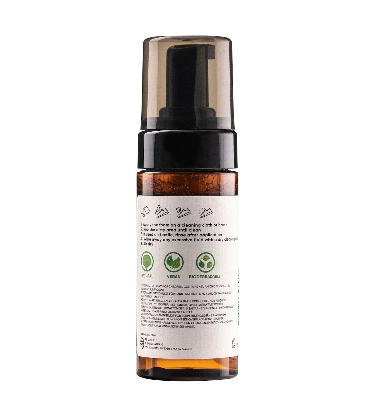 Vannbasert og skånsomt rengjøringsskum med sukkerrørsekstrakt, et naturlig stoff som virker effektivt mot flekker. Enkel å påføre og bruke uten behov for vann. Etterlater en frisk duft med innslag av natur. Egnet for alle typer materialer, spesielt semsket skinn/nubuck og andre sensitive materialer.