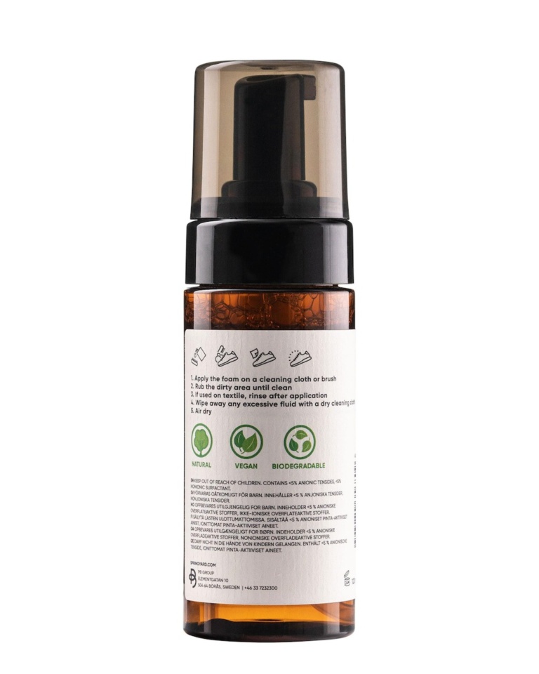 Vårt rengjøringsskum, Foam Cleaner, er en vannbasert rengjøring som enkelt kan brukes uten å tilsette ekstra vann i rengjøringsprosessen. Pump ut skummet på børsten eller kluten og rengjør skoen.