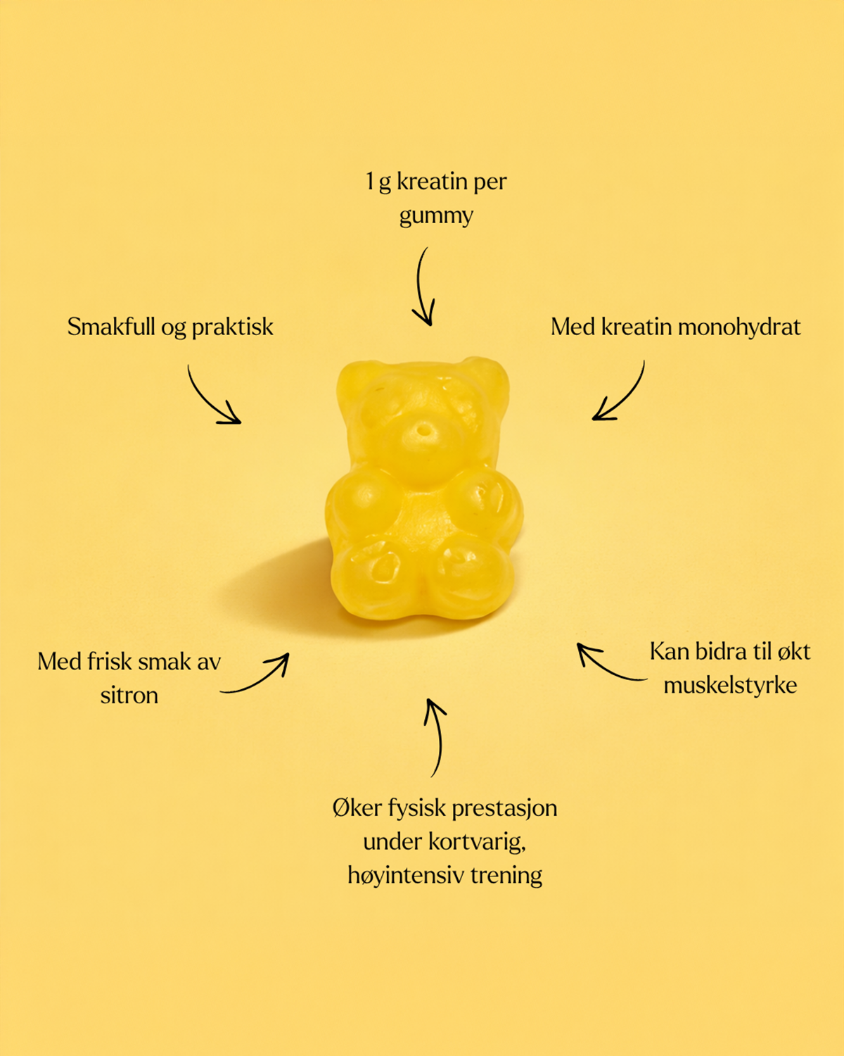 INGREDIENSER: Glukose, sukker, kreatinmonohydrat, sorbitol, geleringsmiddel (pektin), surhetsregulerende middel (sitronsyre), gurkemeiepulver, naturlig aroma (sitron), overflatebehandlingsmiddel (karnaubavoks), kokosolje. "