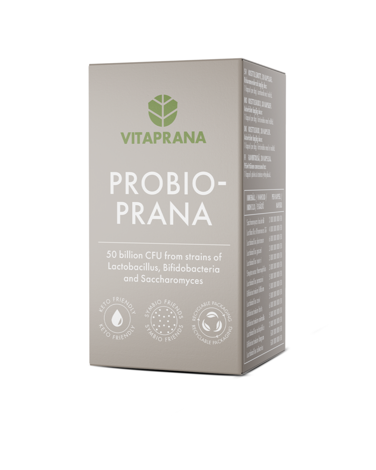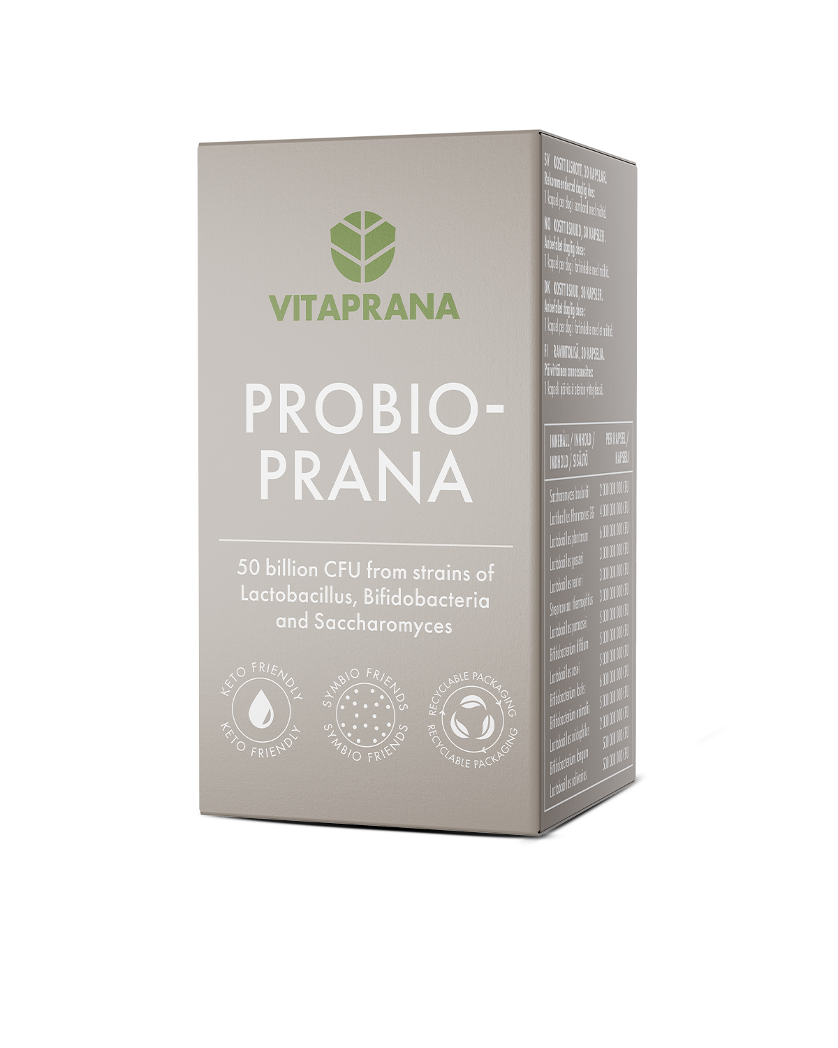 Bakterier finnes overalt rundt oss, også i kroppene våre. Den høyeste konsentrasjonen finnes i tykktarmen, hvor det er rundt 1 kg bakterier fra et stort antall ulike stamme. Med Probioprana kan du enkelt øke inntaket av Bifidobacteria, Lactobacillus og Saccharomyces boulardii. Én enkelt kapsel gir hele 50 milliarder kolonidannende enheter fra 14 ulike stammer, som blant annet øker mengden melkesyre og butyrat i tarmen. Kapslene er uten unødvendige fyllstoffer.