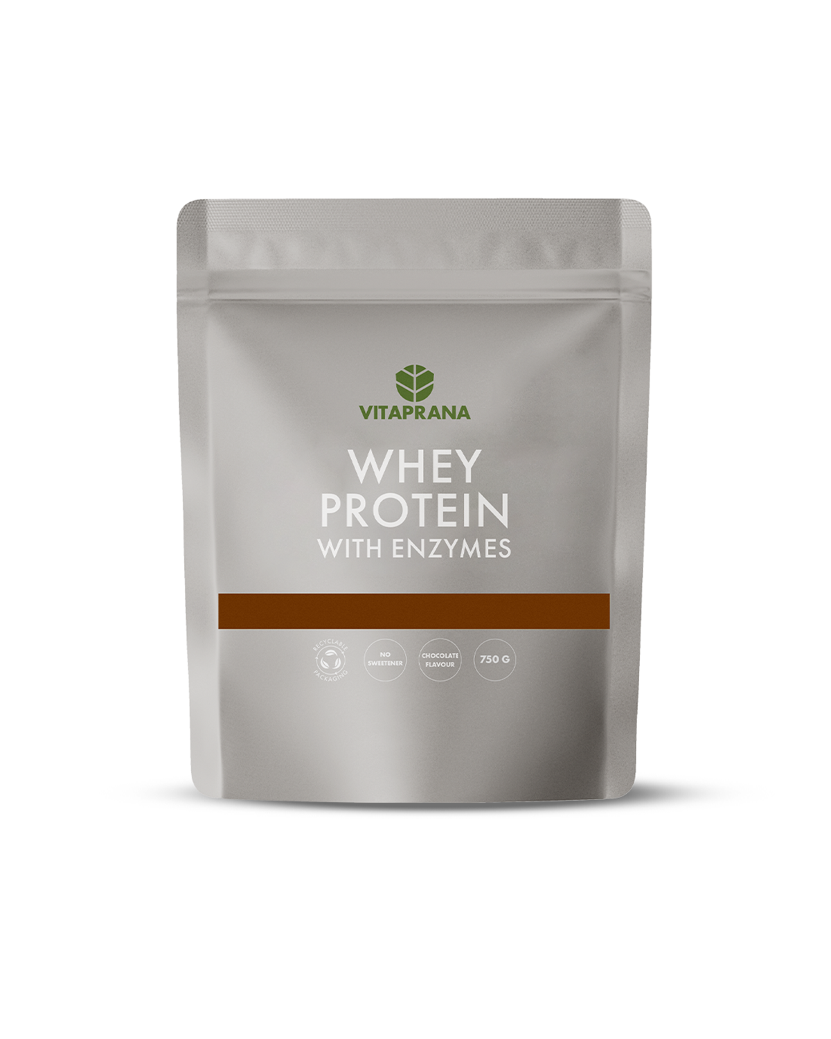 Whey Protein with enzymes inneholder akkurat det navnet sier, også enzymer. Disse er amylase, protease, laktase, lipase og cellulase. I rekkefølge bryter de ned karbohydrater, protein, laktose, fett og cellulose. Enzymer tilsettes for å støtte fordøyelsen.