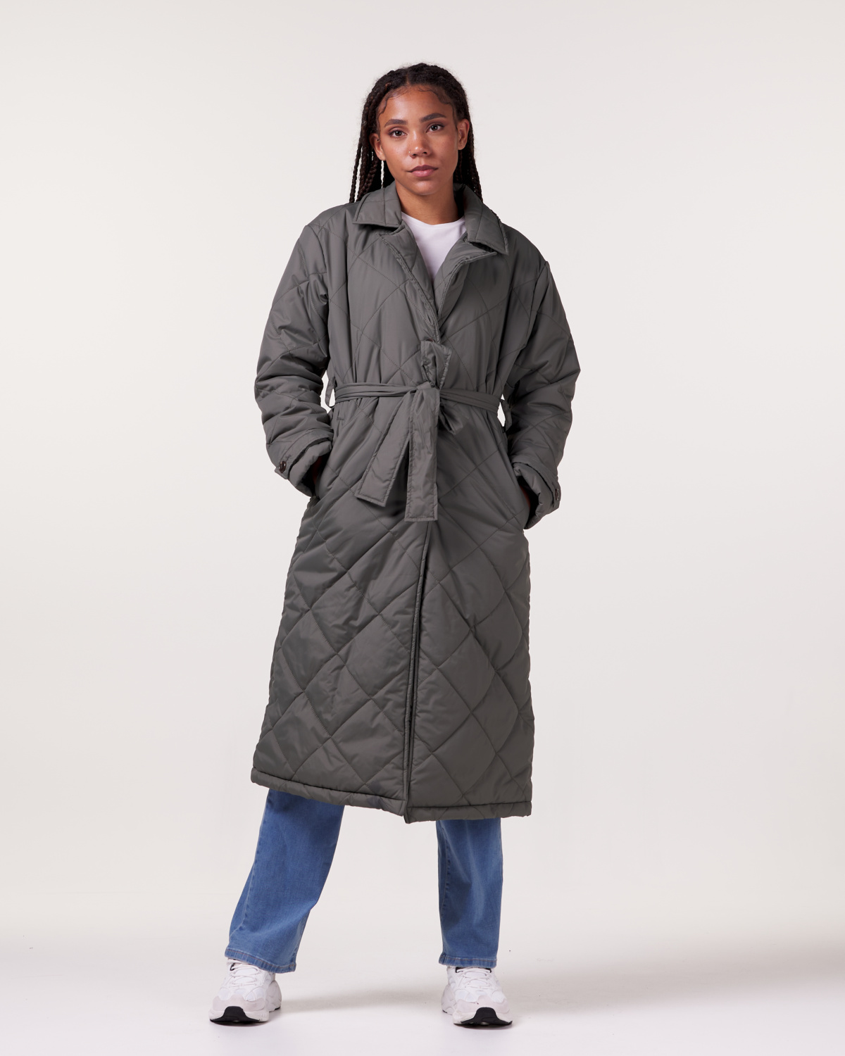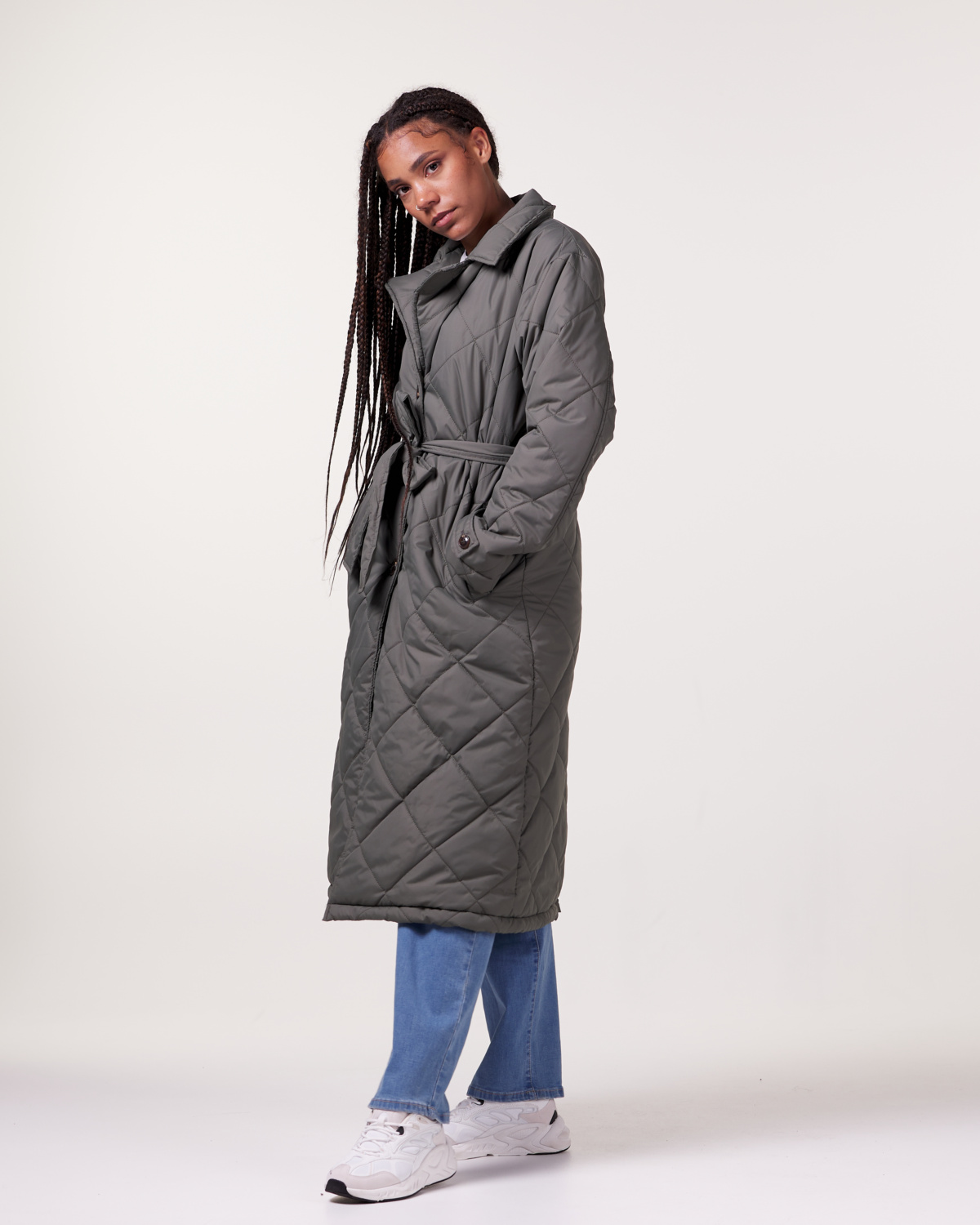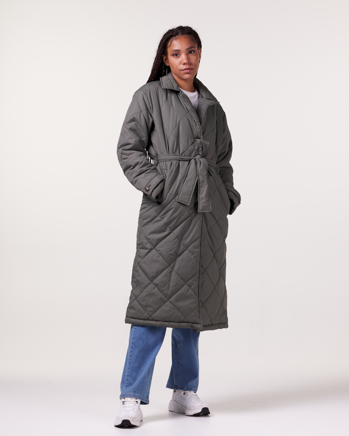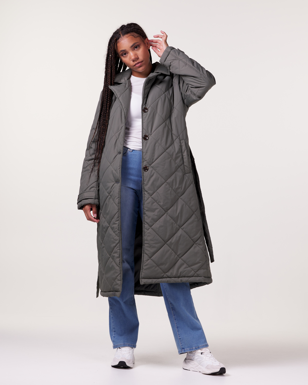“Quilted”-kåpe i legglengde med tynn polstring og knytbar stropp ved midjen. Den har en krage, knepping foran og sidelommer. Den har også justerbart bånd med spenne rundt enden av ermet.