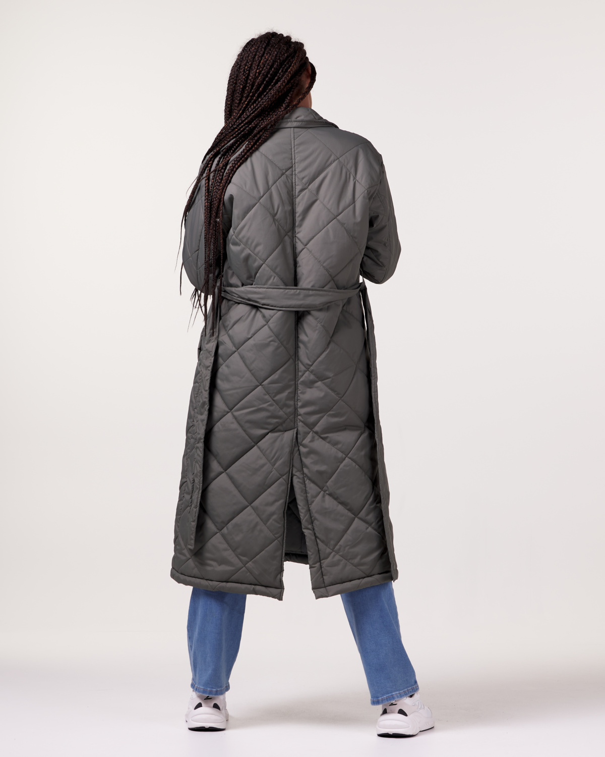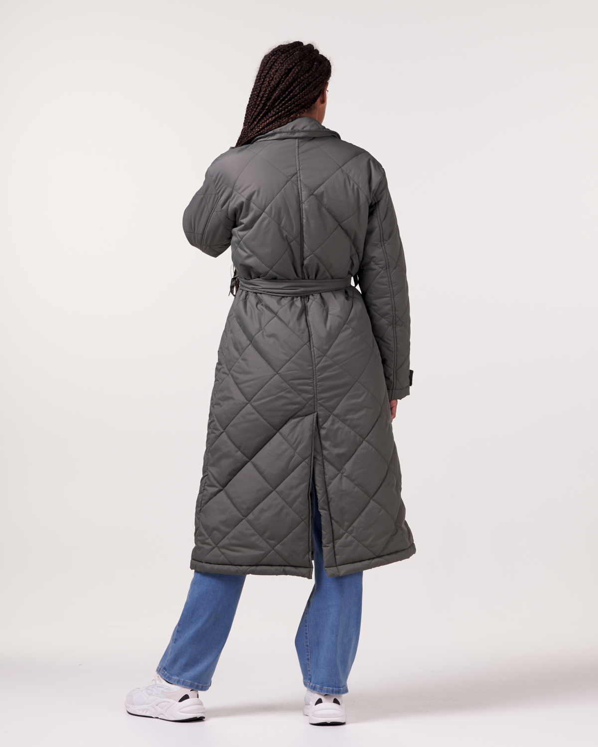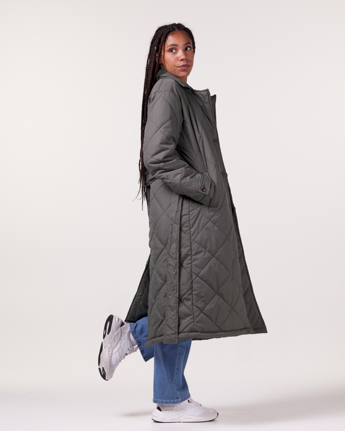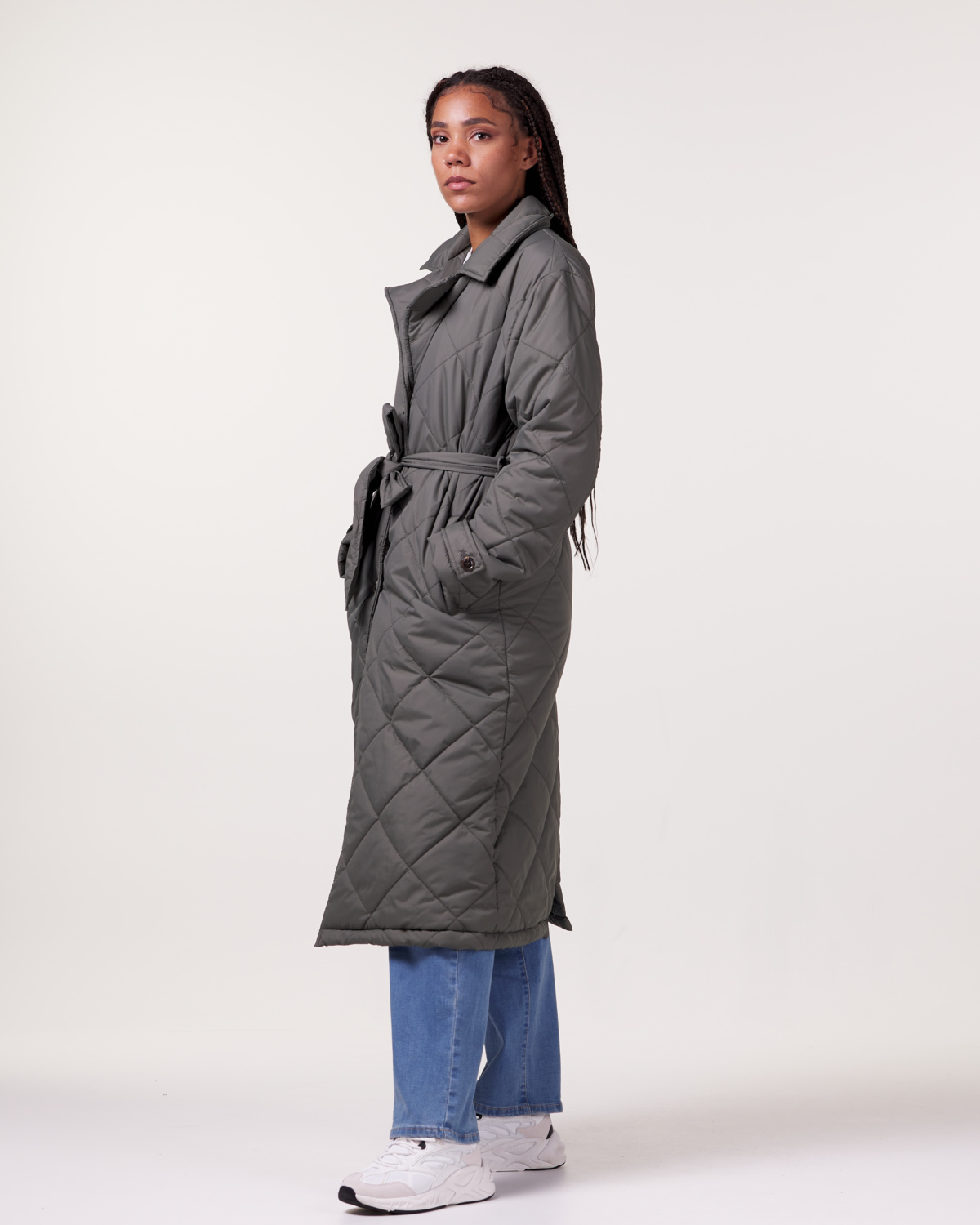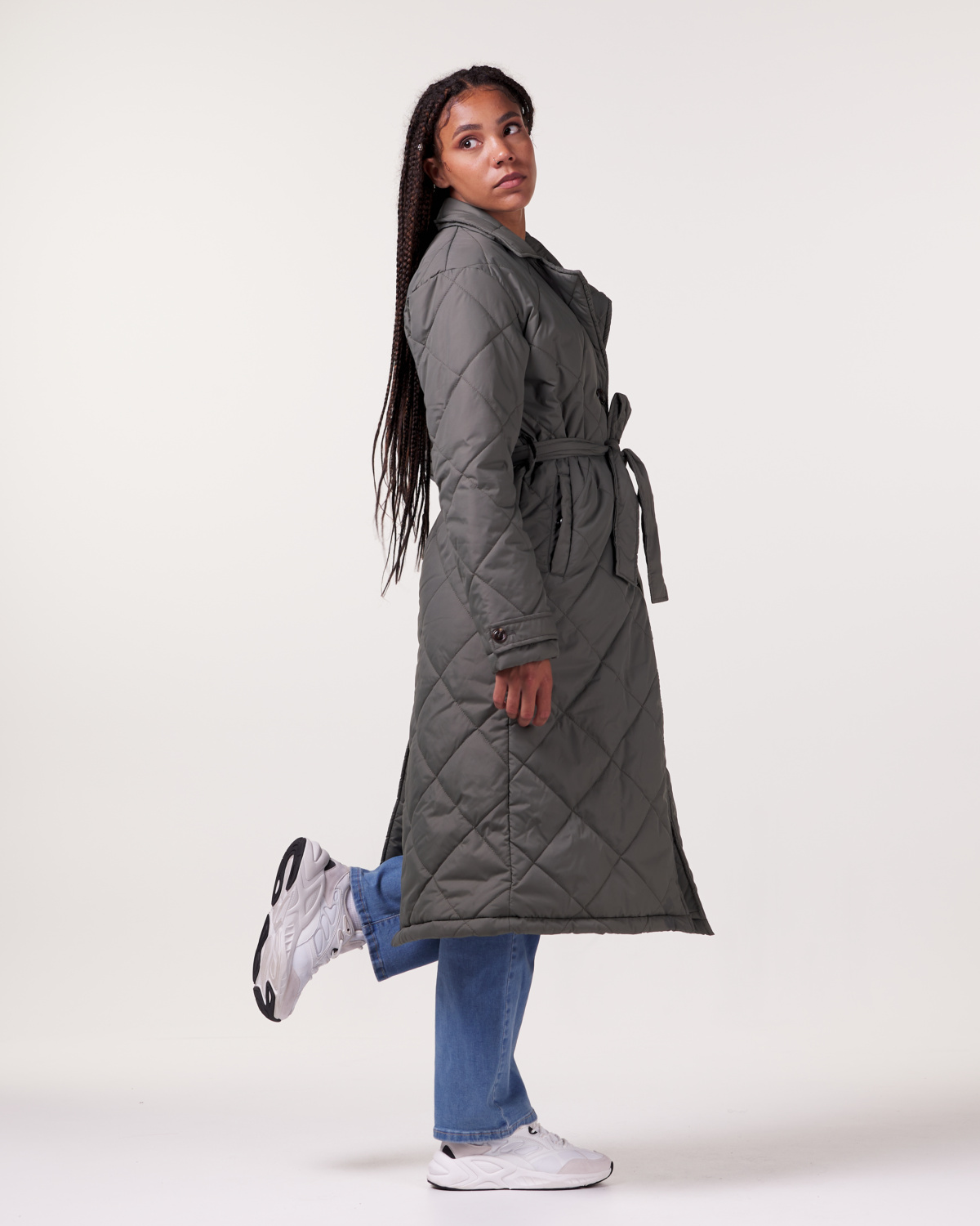 “Quilted”-kåpe i legglengde med tynn polstring og knytbar stropp ved midjen. Den har en krage, knepping foran og sidelommer. Den har også justerbart bånd med spenne rundt enden av ermet.
