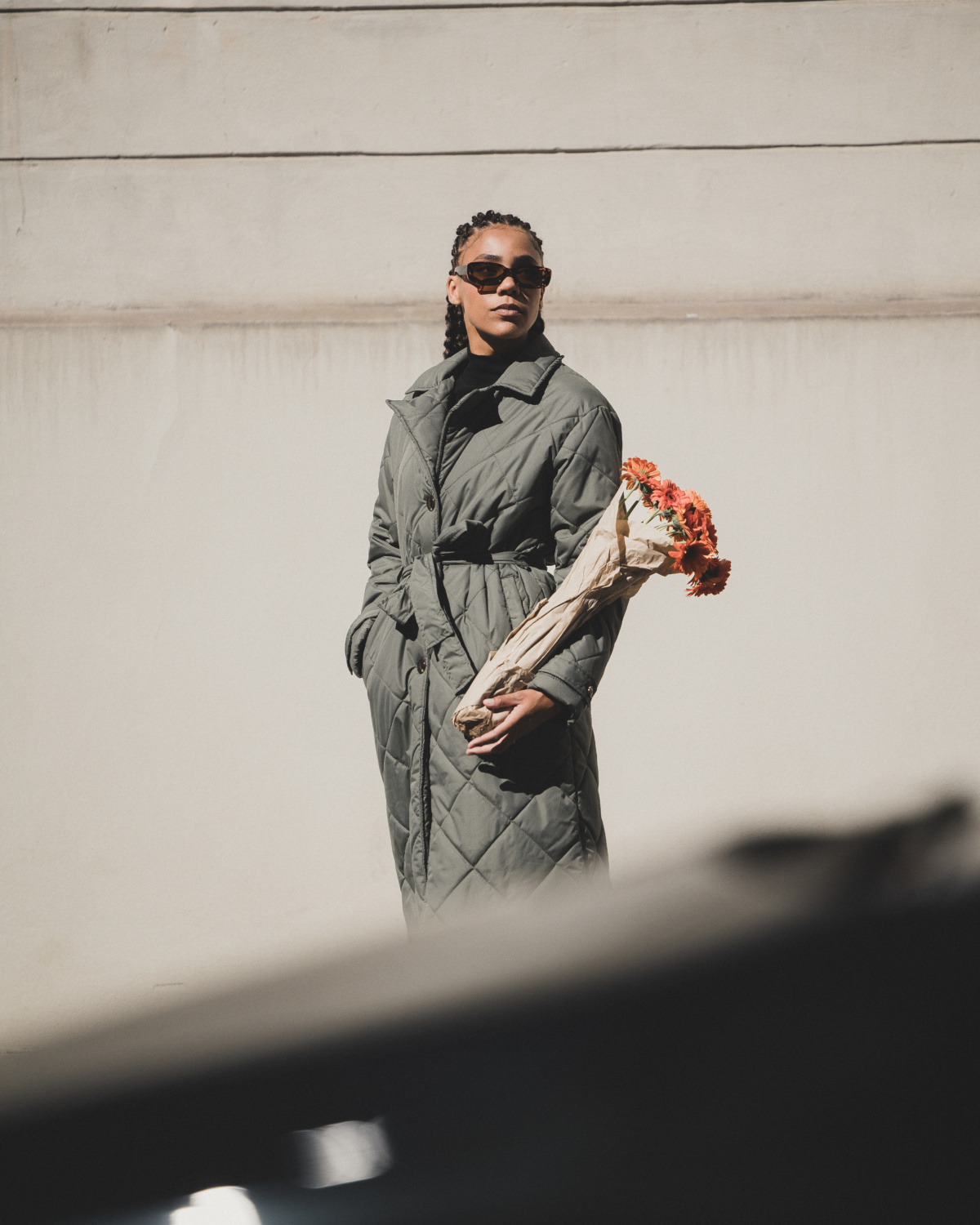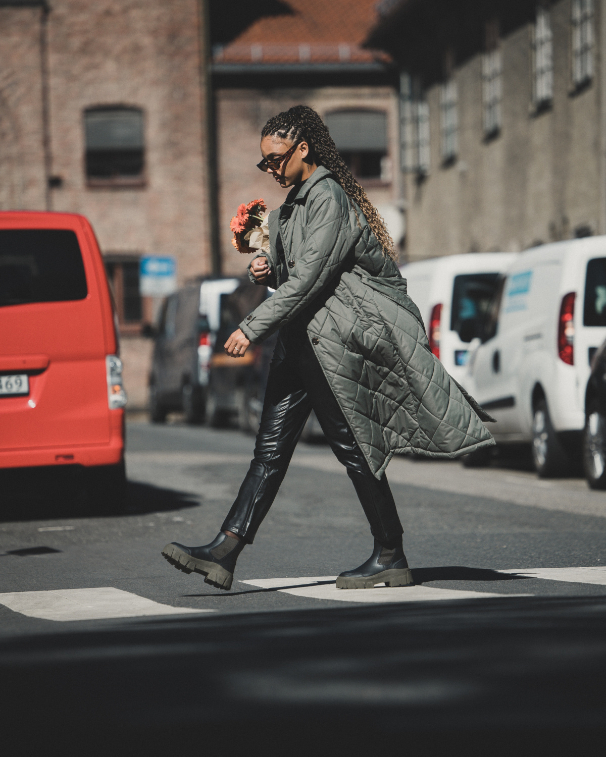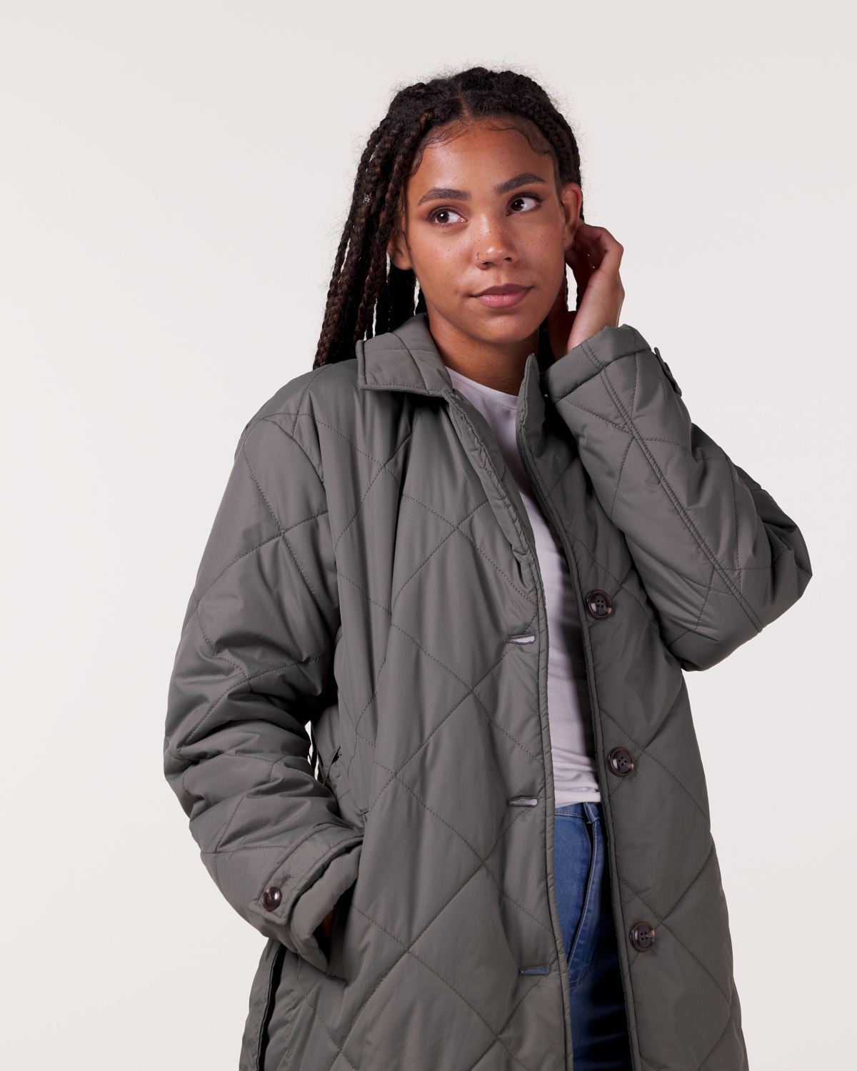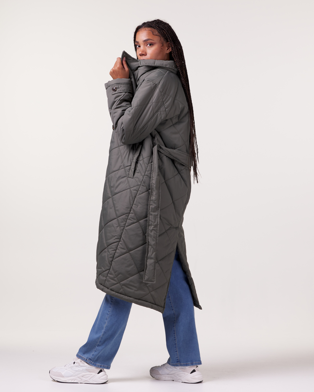 “Quilted”-kåpe i legglengde med tynn polstring og knytbar stropp ved midjen. Den har en krage, knepping foran og sidelommer. Den har også justerbart bånd med spenne rundt enden av ermet.