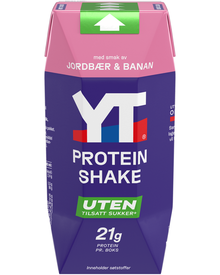 YT® Proteinshake UTEN med smak av Jordbær & Banan er en luftig drikk rik på proteiner. Den er laktosefri og uten tilsatt sukker, med et naturlig innhold av sukker fra melk. Inneholder søtstoffer. YT® Proteinshake får du nå på kartong med 70 % mindre plast enn i vår forrige emballasje.