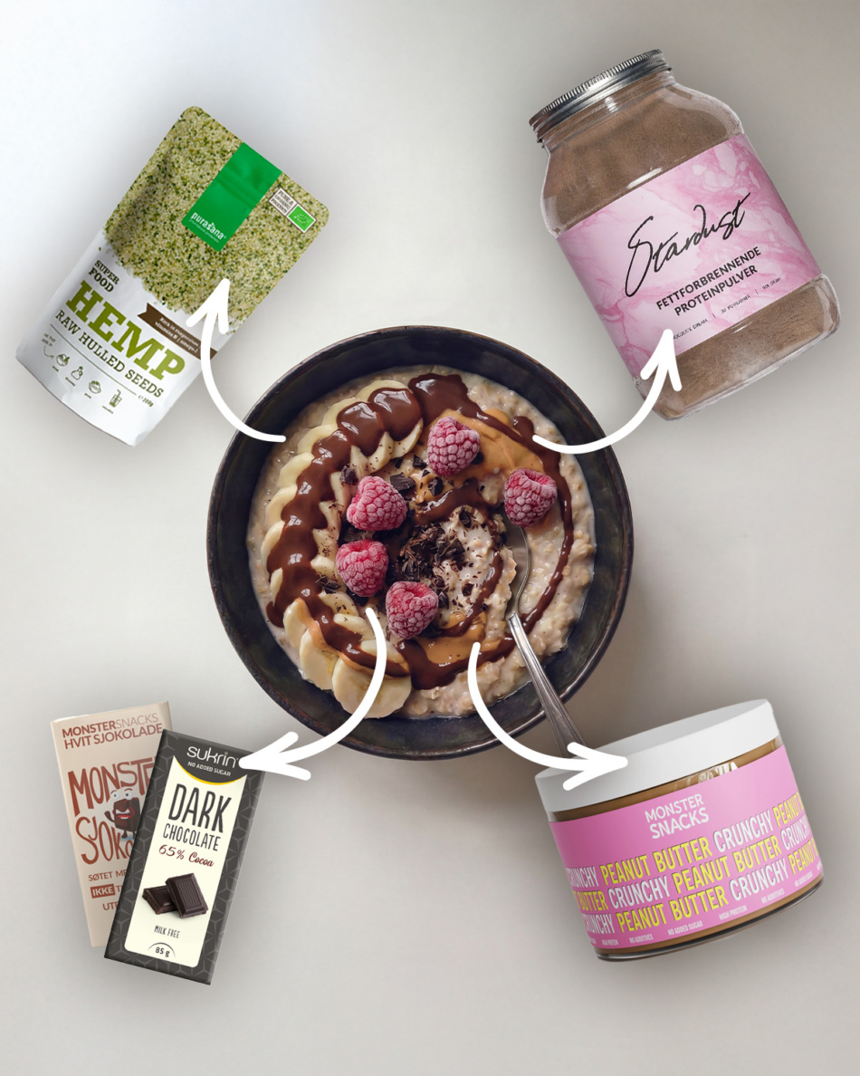 Start med en god base: Kok havregrøt slik du liker den – med vann, melk eller plantebasert alternativ. Ønsker du en ekstra kremet konsistens, kan du røre inn litt proteinpulver mot slutten av koketiden.